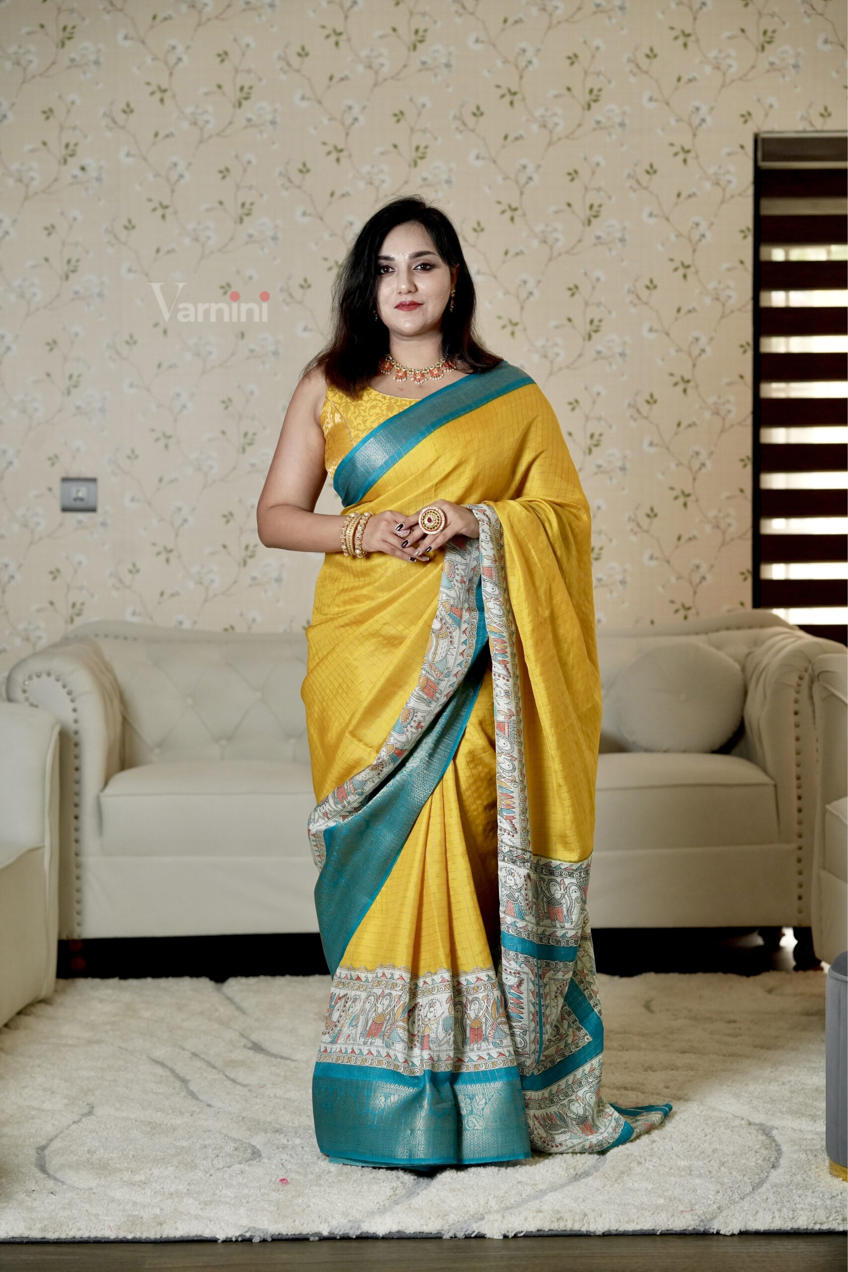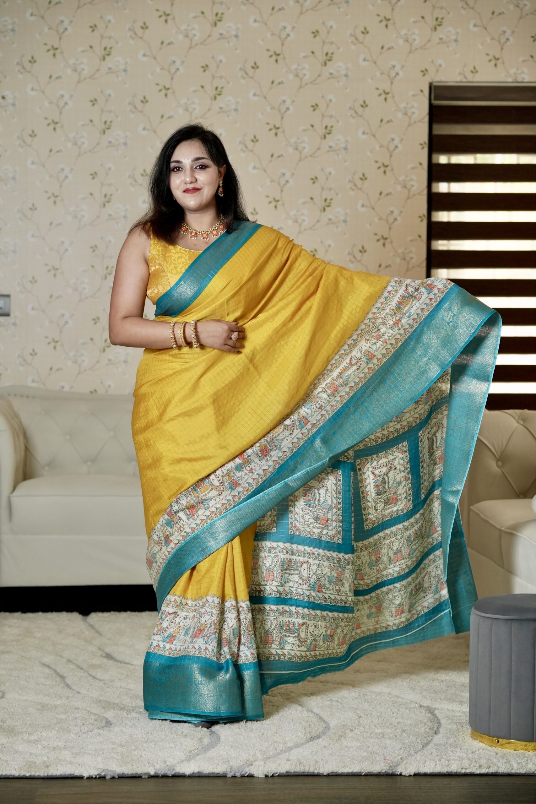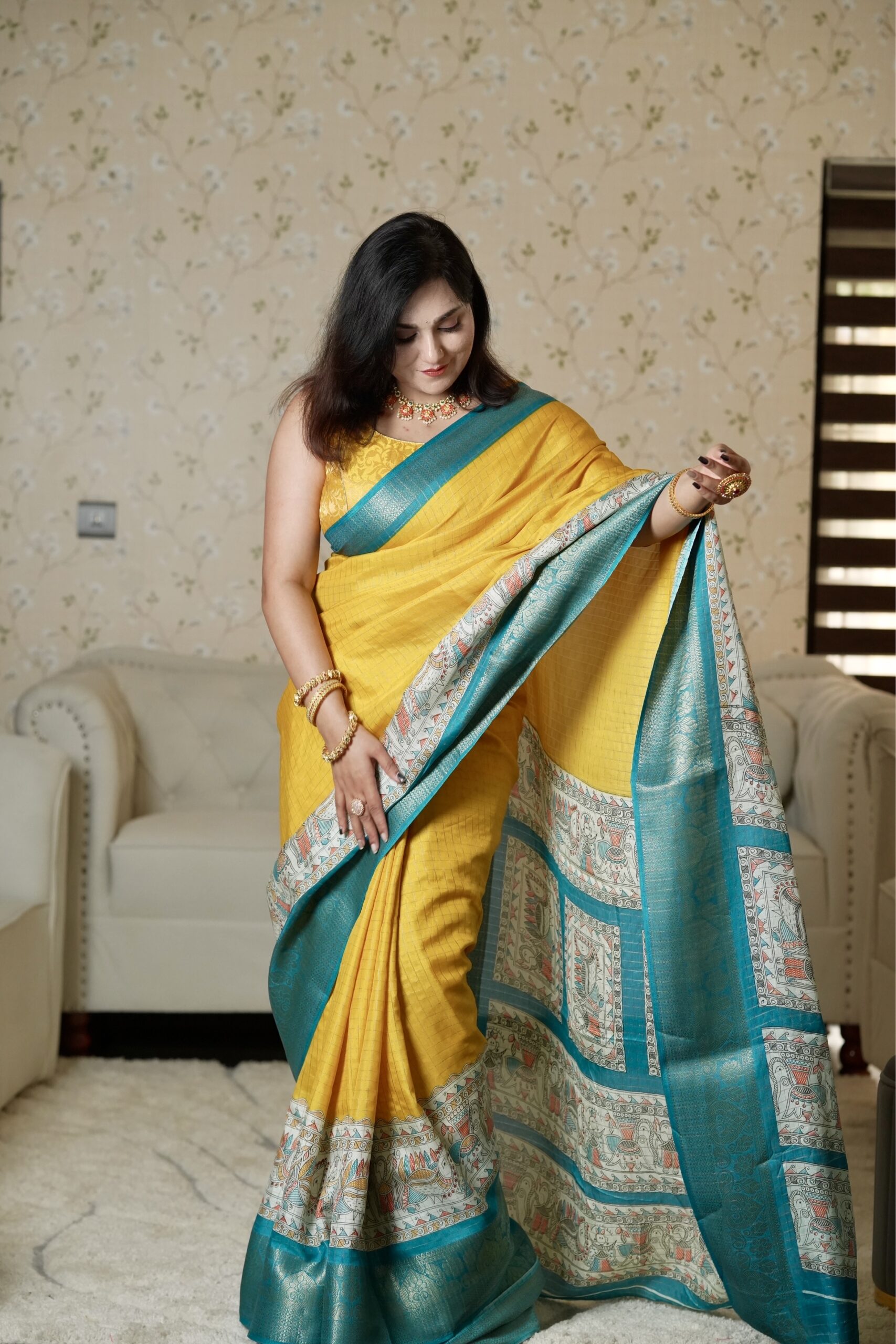 The deep ochre yellow body is enhanced by vibrant teal accents, creating a bold and sophisticated contrast. Intricate Madhubani-style motifs adorn the borders and grand pallu, finished with antique silver zari for a refined touch.