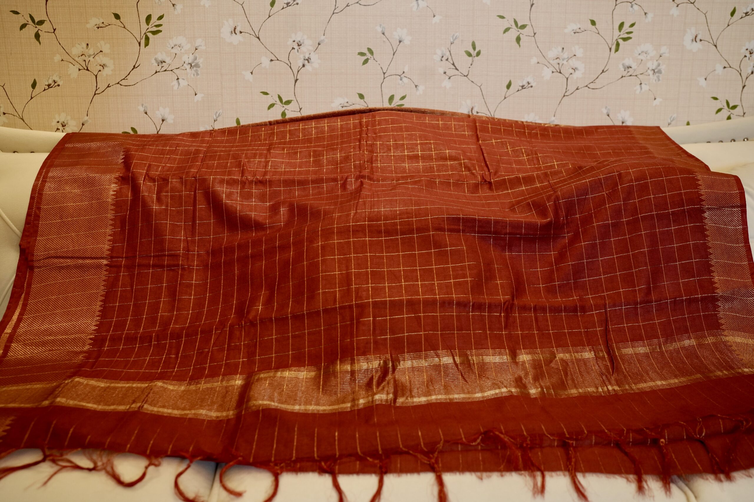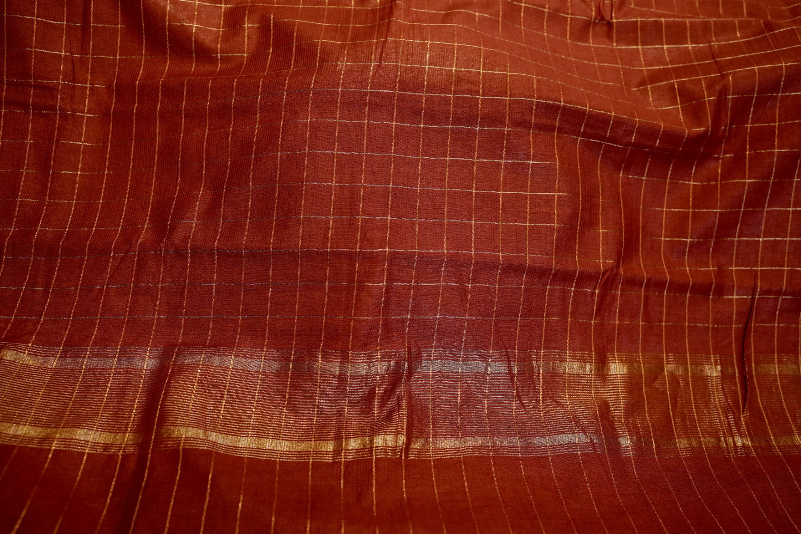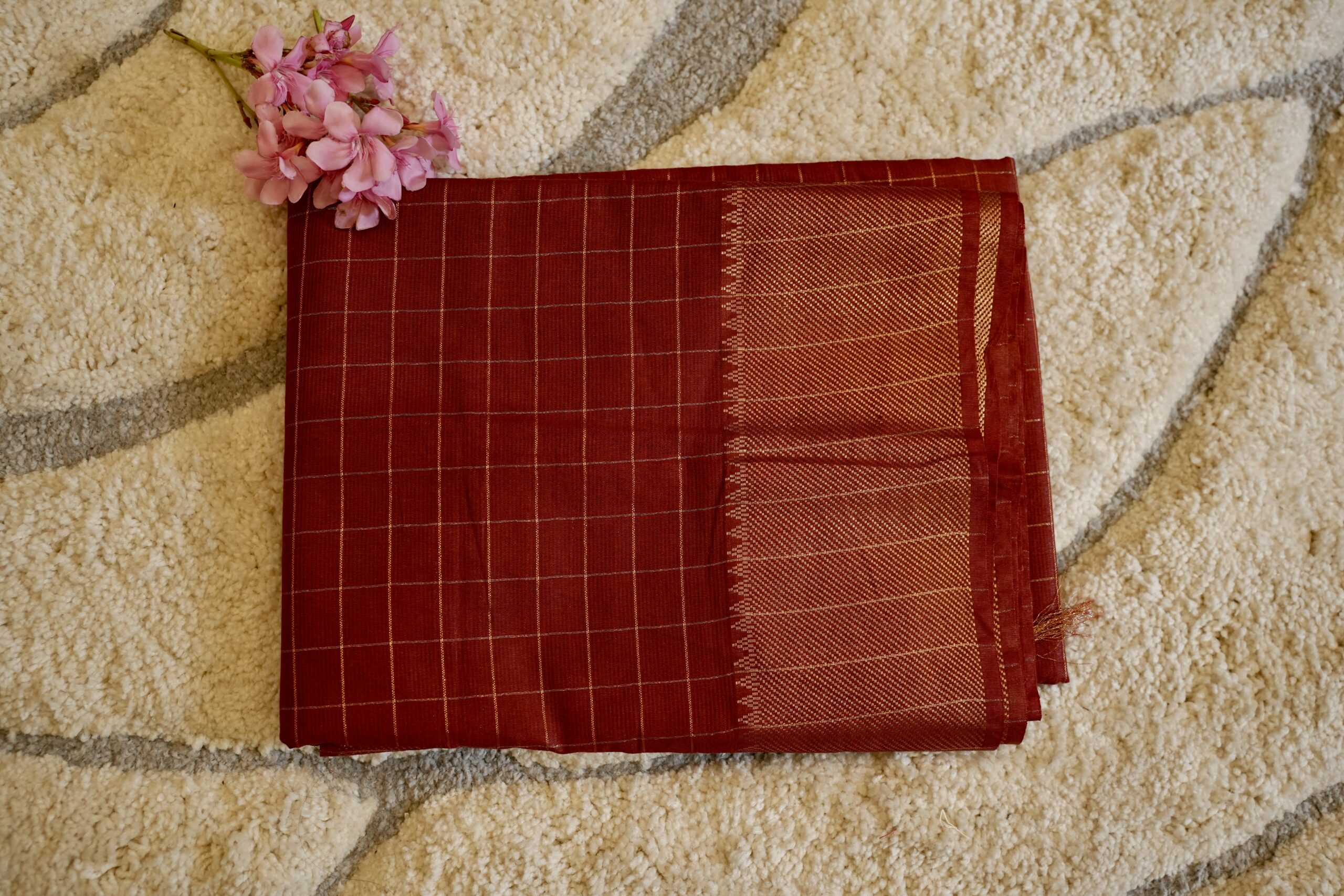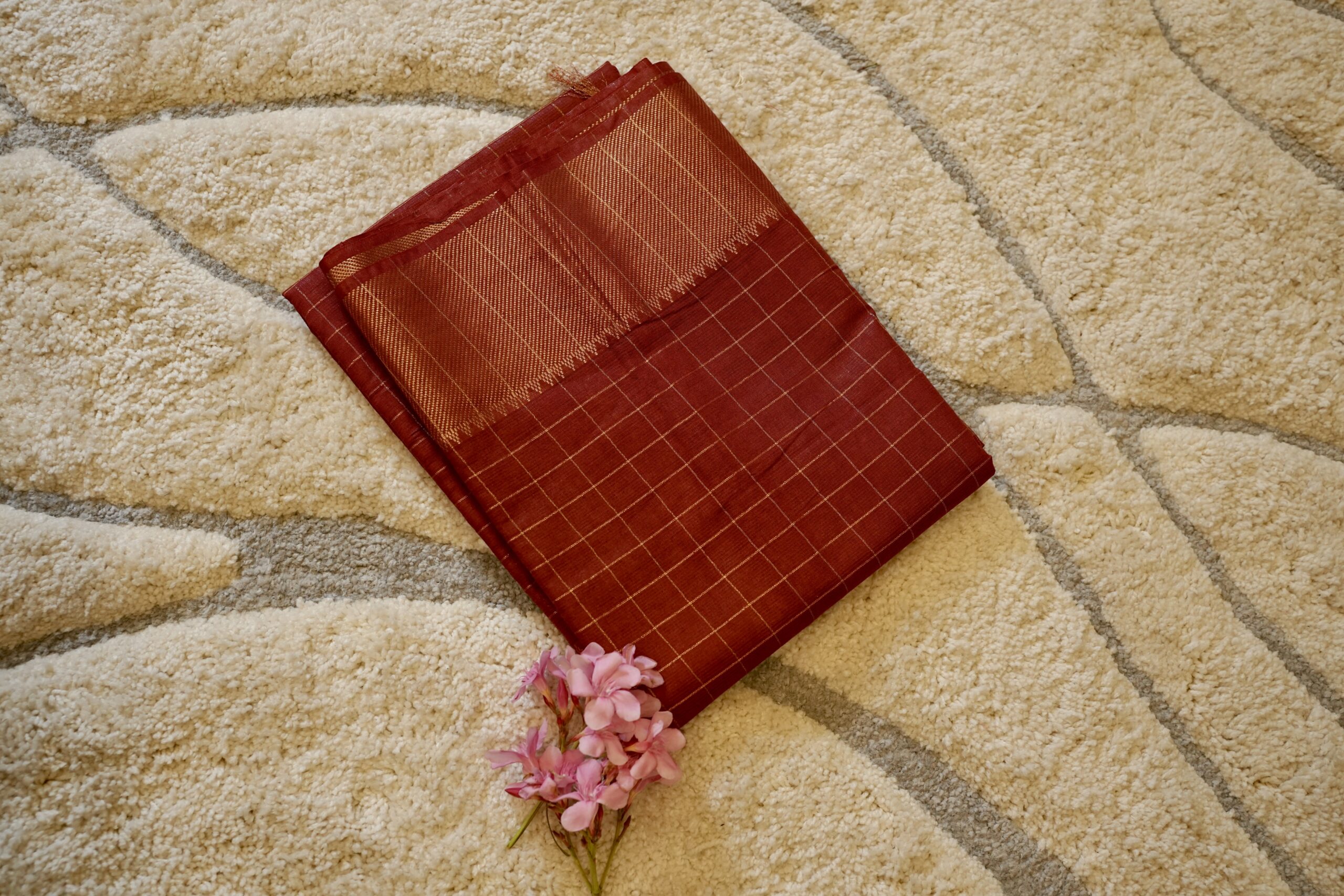 The Body: Features a fine Zari Check (Kattam) pattern, creating a subtle, shimmering grid across the entire drape.