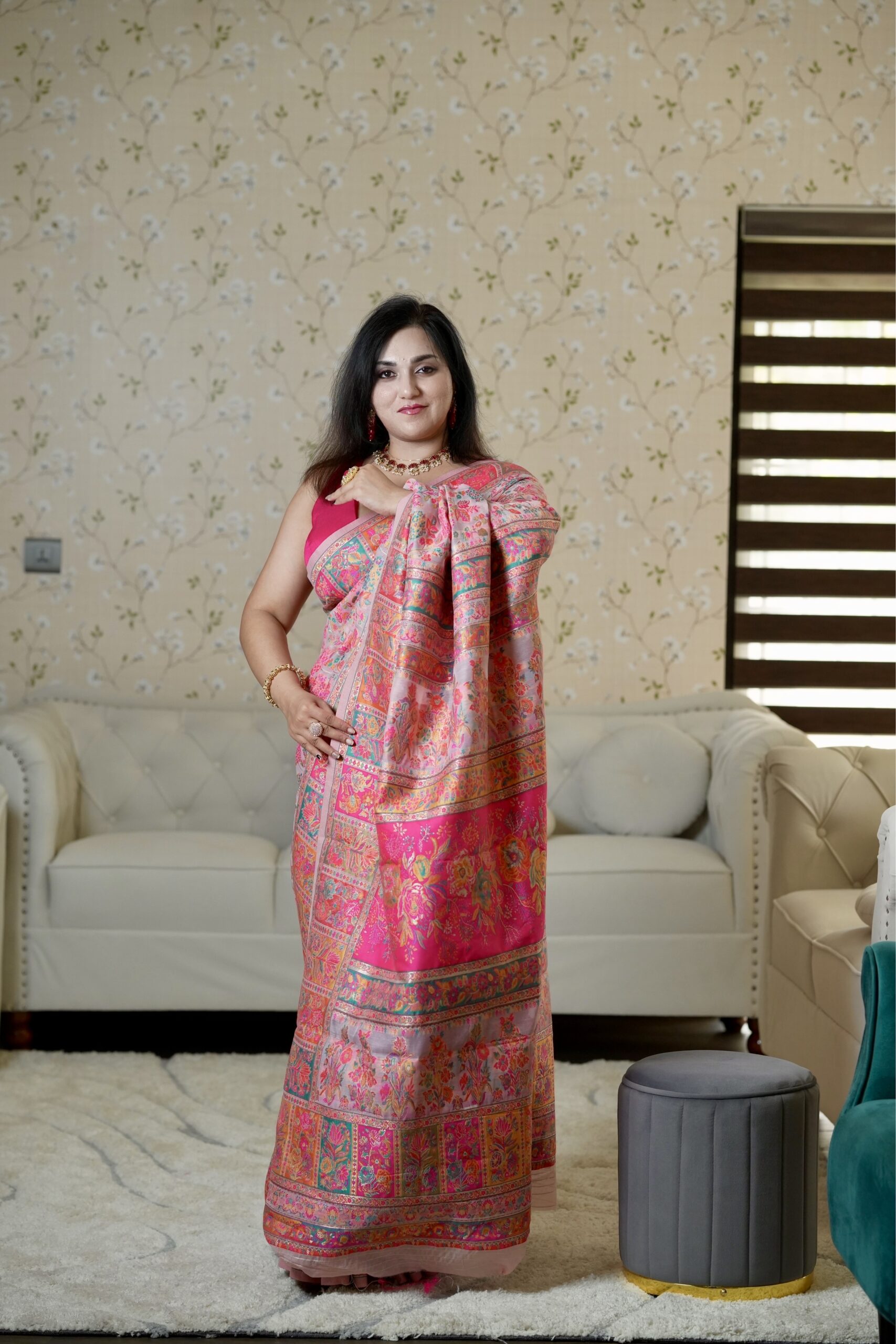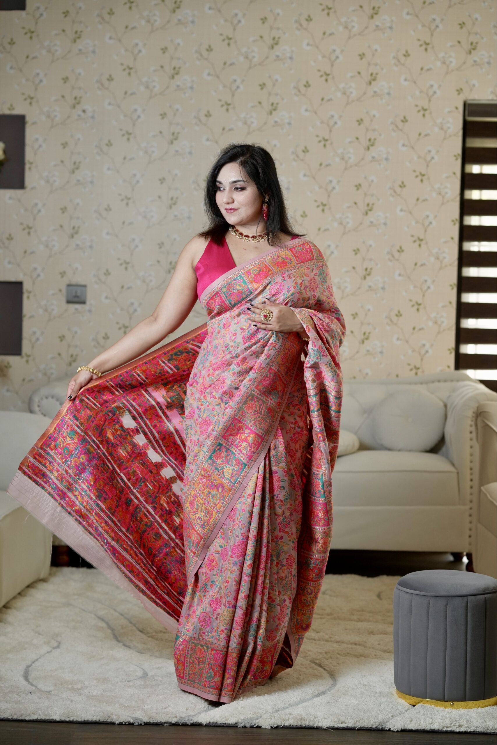Delicate yet opulent, this blush rose saree is a celebration of intricate craftsmanship and timeless femininity. The soft pastel pink base forms an elegant canvas for an explosion of multicolored floral artistry, reminiscent of heritage Kashmiri garden weaves.