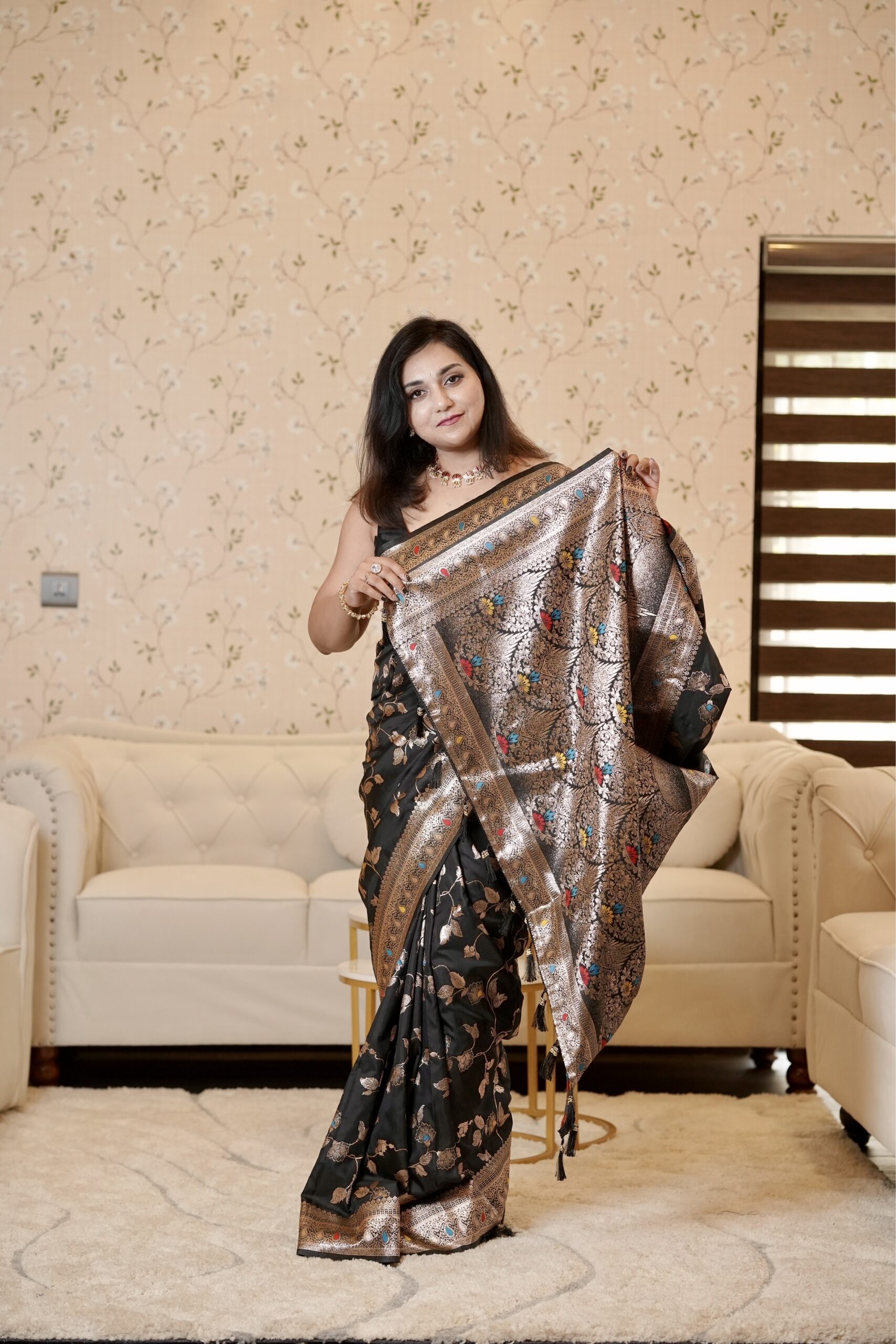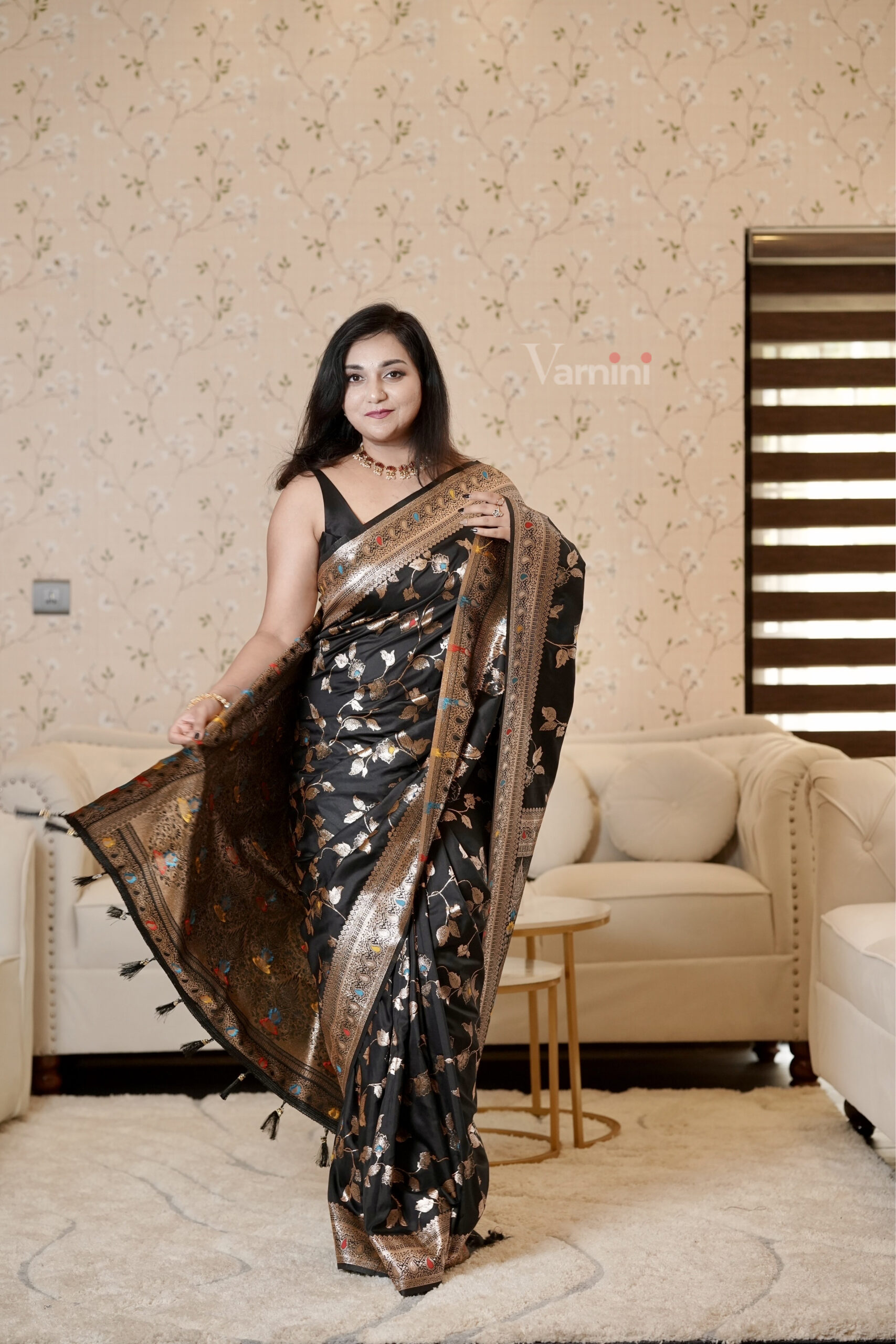 A bold expression of timeless elegance, this black silk saree features intricate copper-gold floral vines across a deep onyx base. The richly woven antique gold zari border and grand pallu add depth, heritage charm, and regal sophistication, finished with elegant tassel detailing.