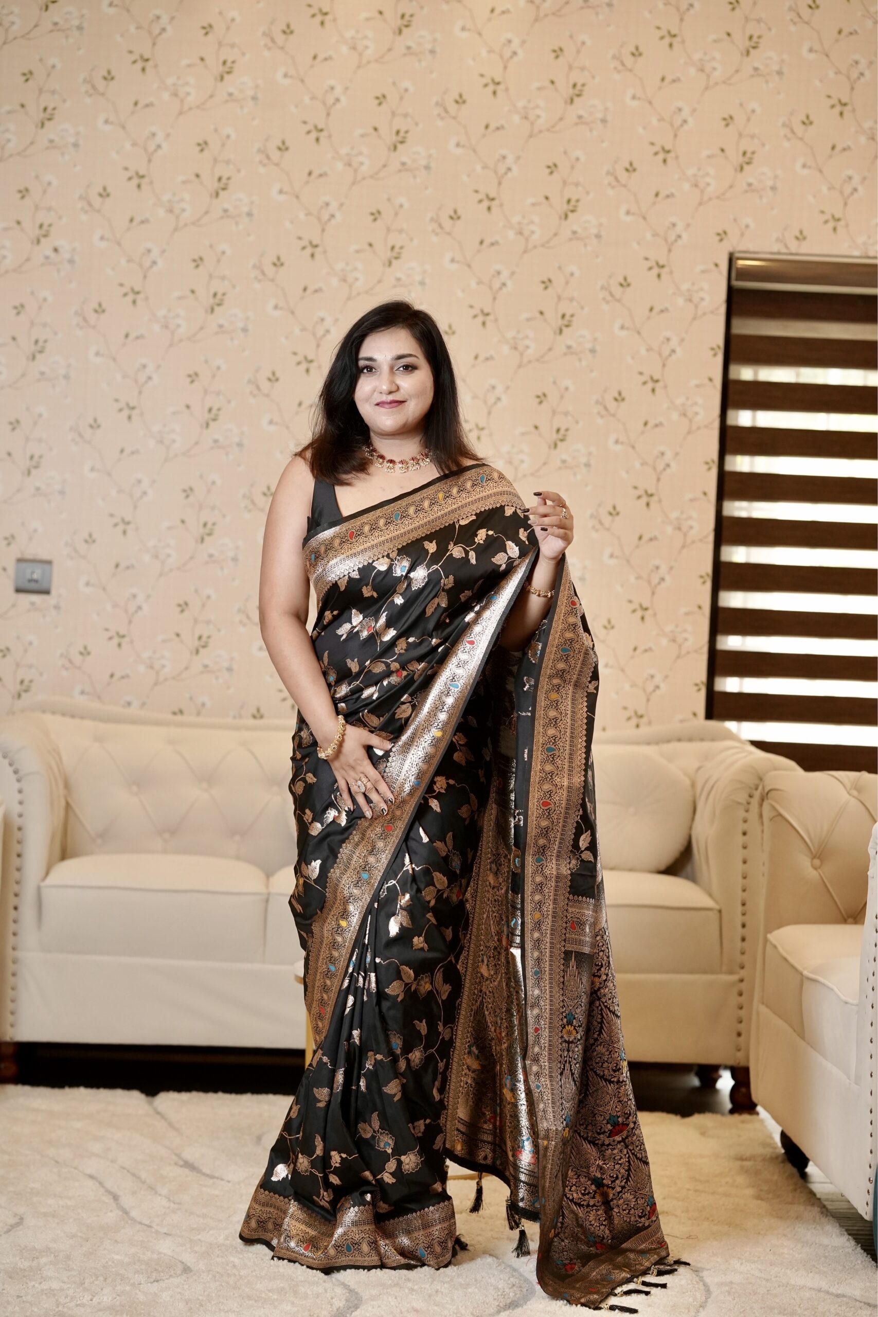 Bold, powerful, and exquisitely detailed, this black silk saree is a celebration of heritage craftsmanship elevated for the modern connoisseur. The deep onyx base sets a dramatic canvas for intricate copper-gold floral vines that gracefully trail across the body, creating a refined yet striking visual texture.