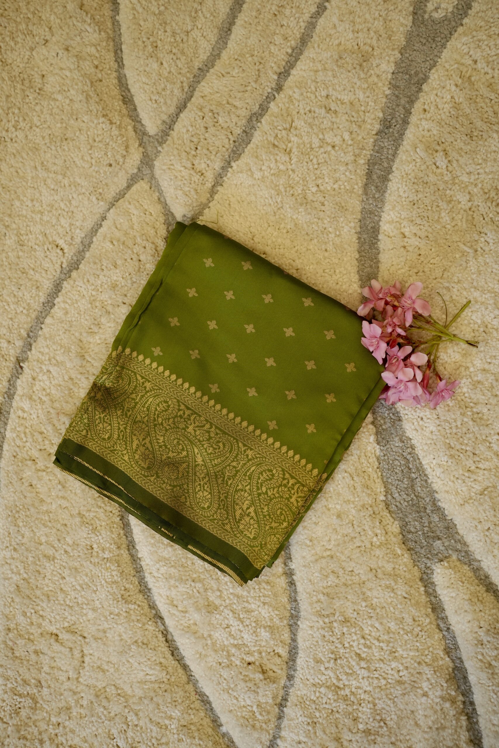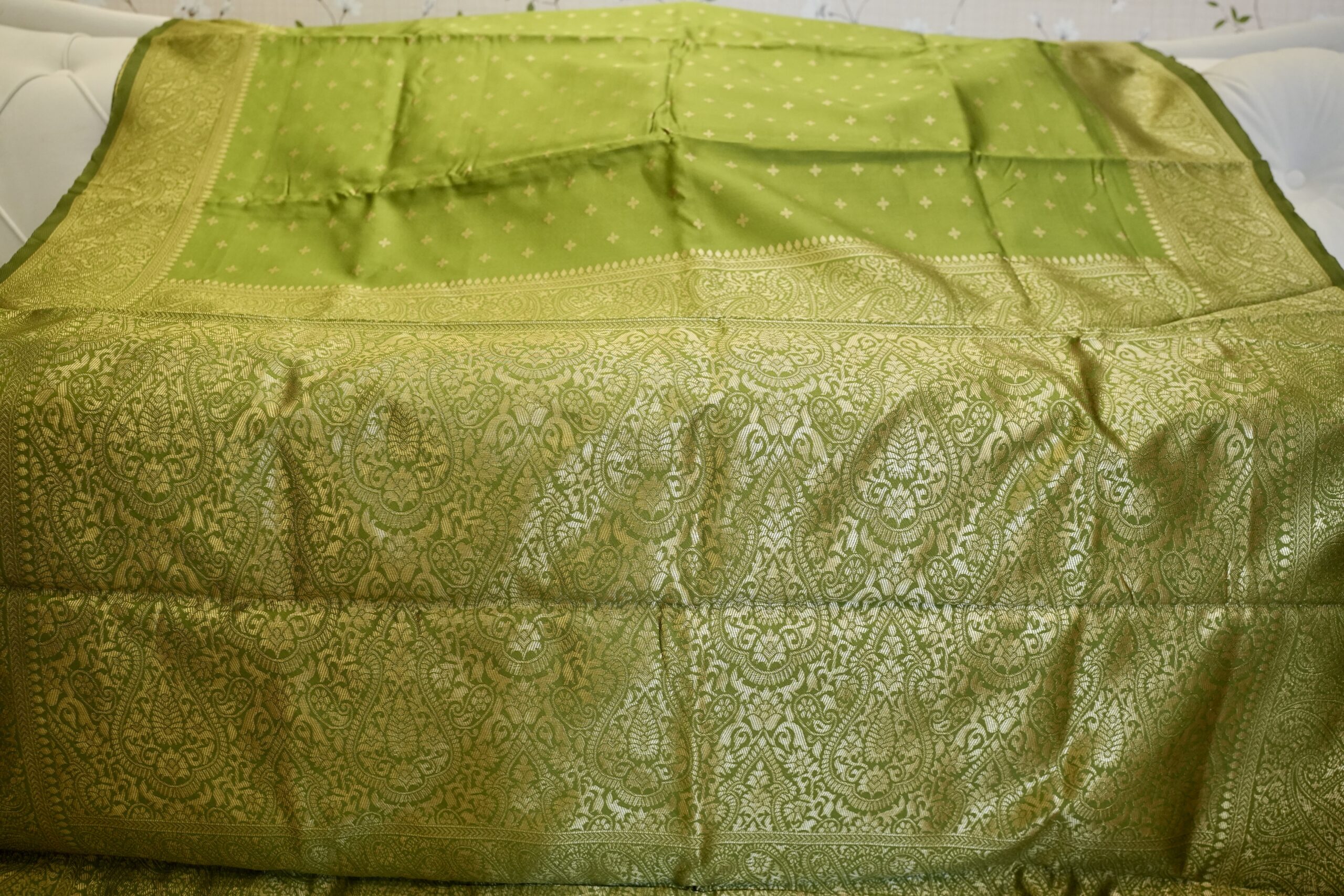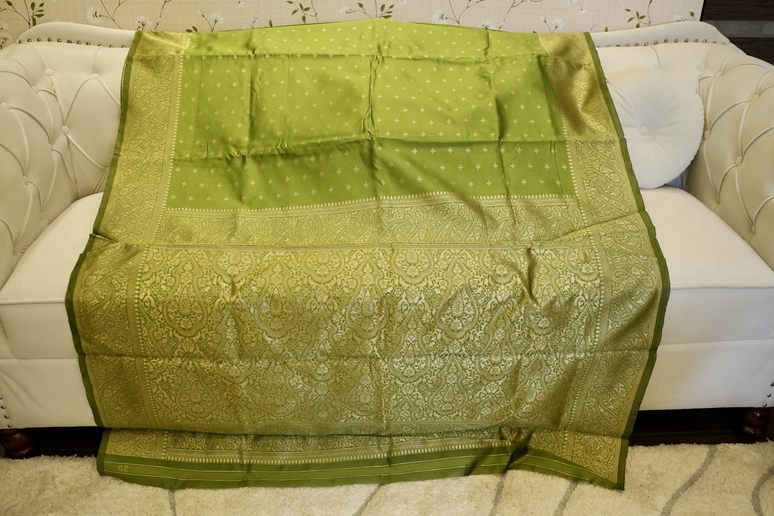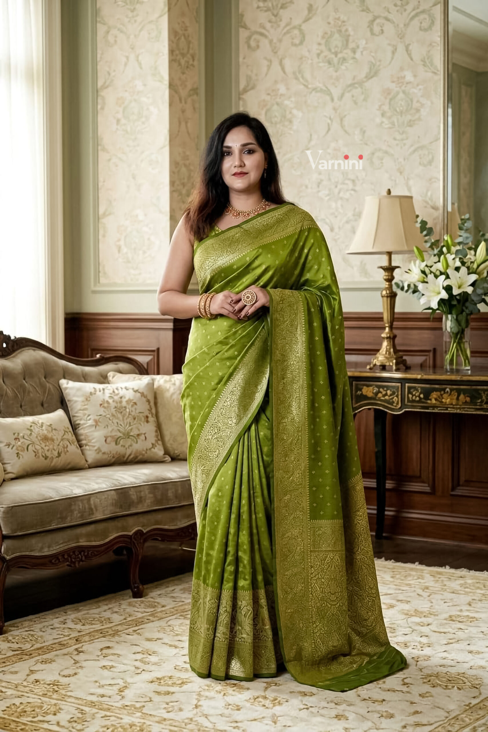 Color Palette: A vibrant Parrot Green (Leaf Green) base, luxuriously complemented by a massive Gold Zari pallu.