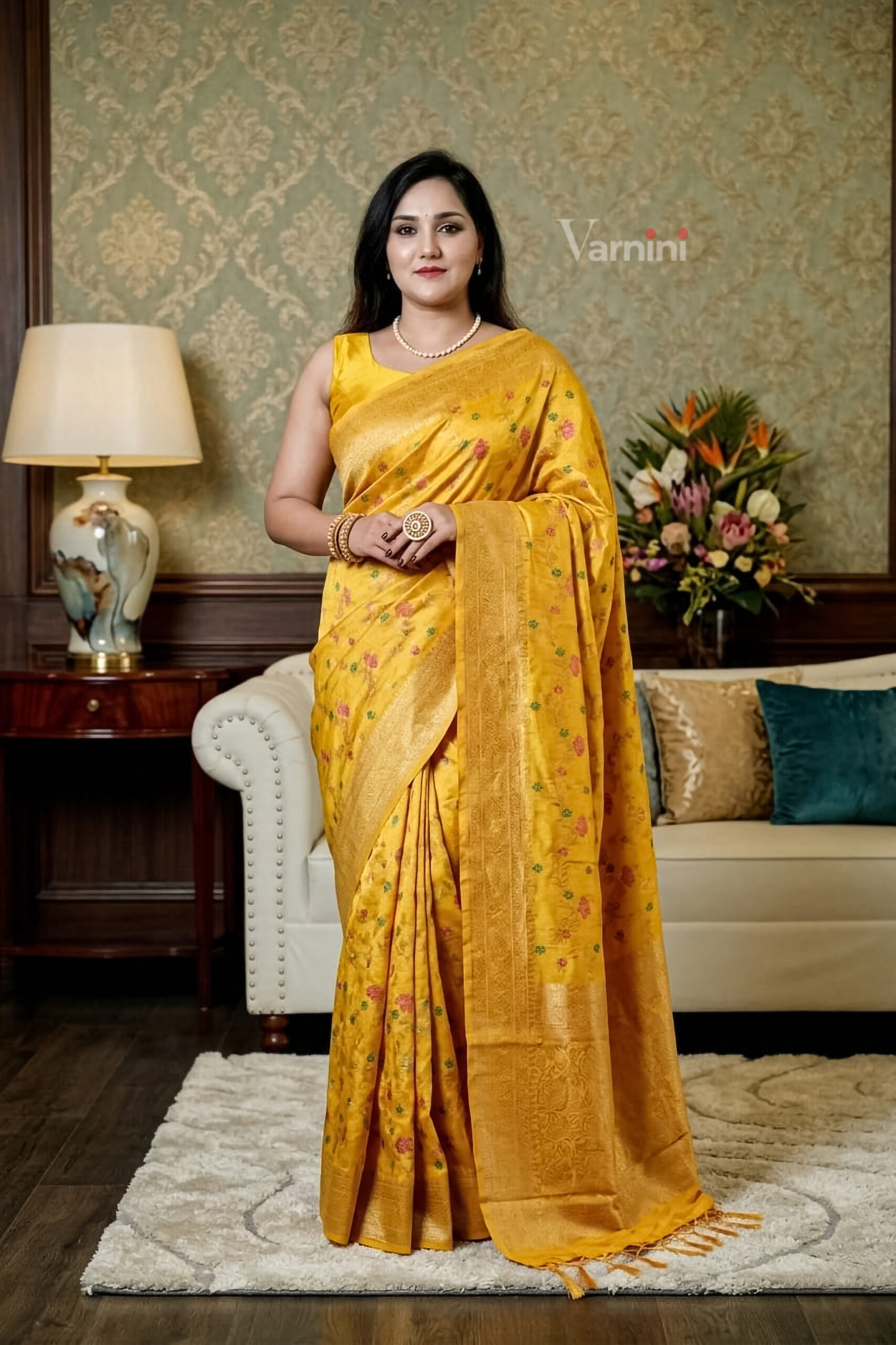 A luminous masterpiece that captures the warmth of a midday sun, this saree is the epitome of heritage-meets-modern-luxury.