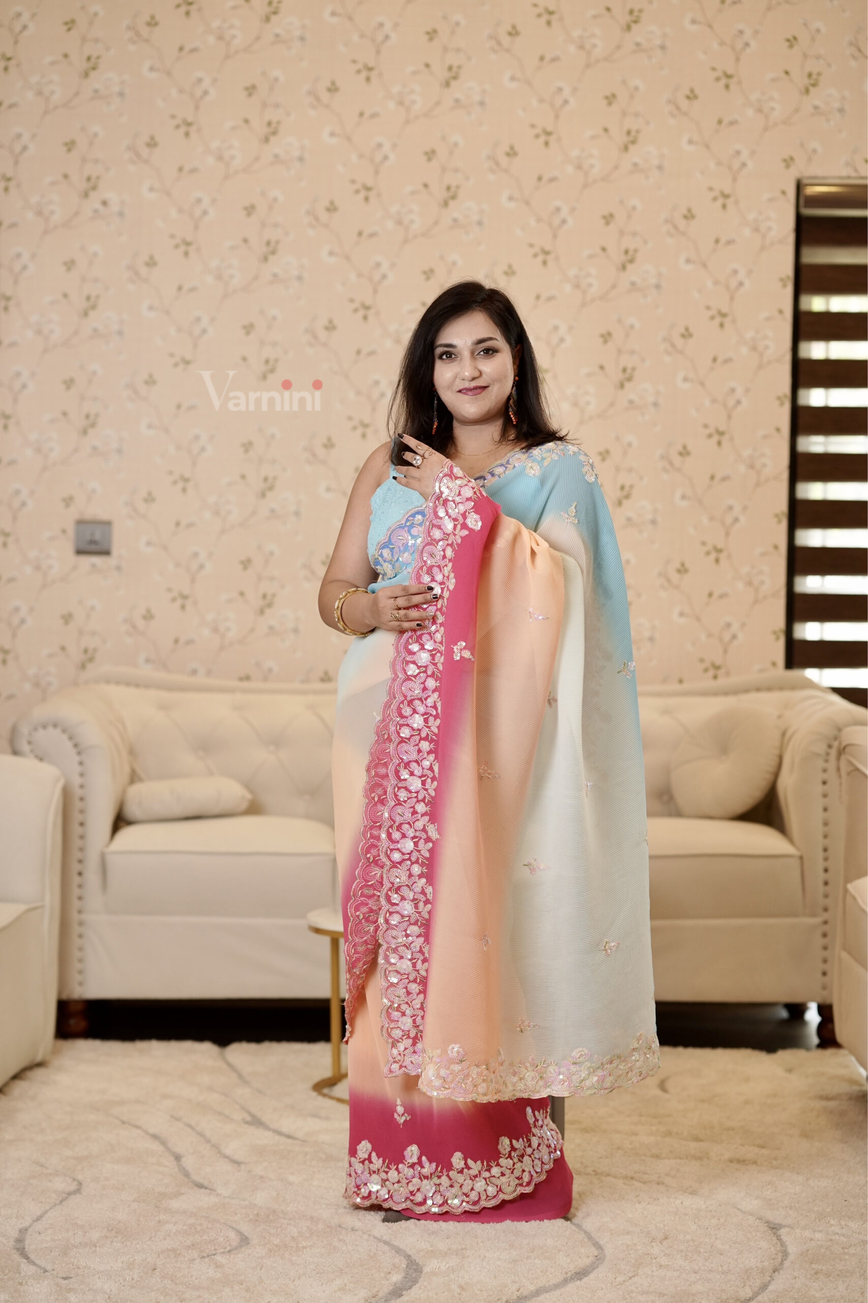 The body remains tastefully minimal, allowing the dramatic border and color transition to take center stage. Subtle embellishments scattered across the drape add just the right touch of sparkle without overwhelming its refined elegance.