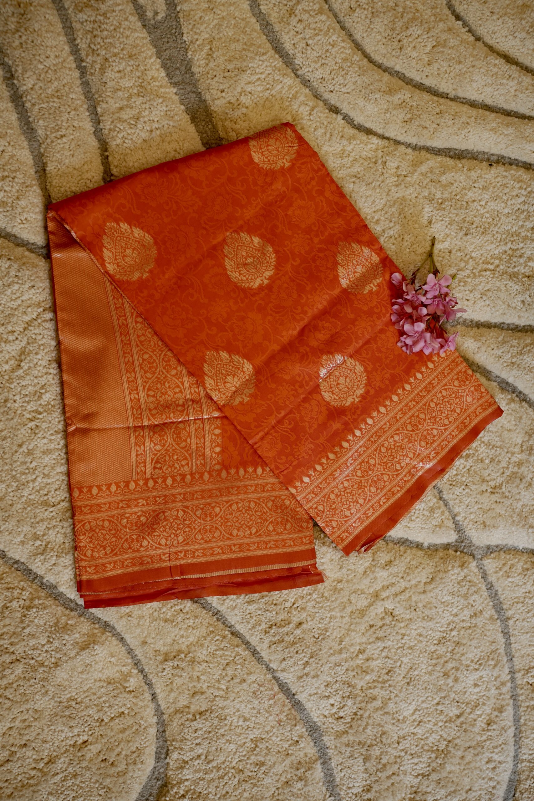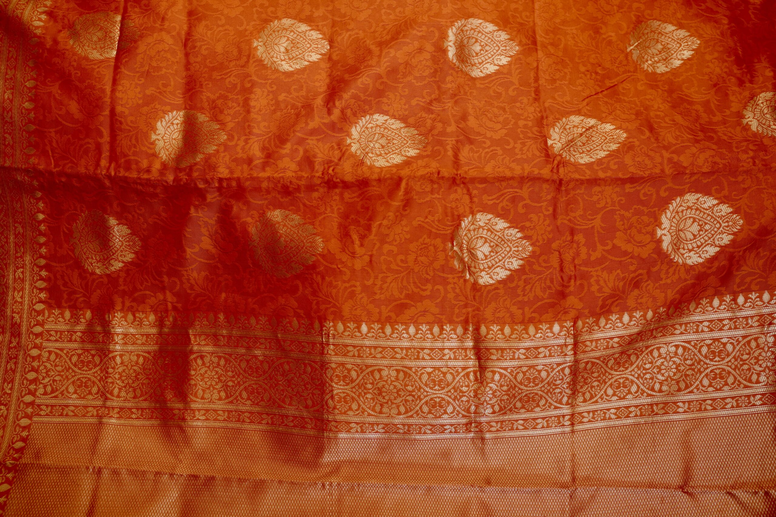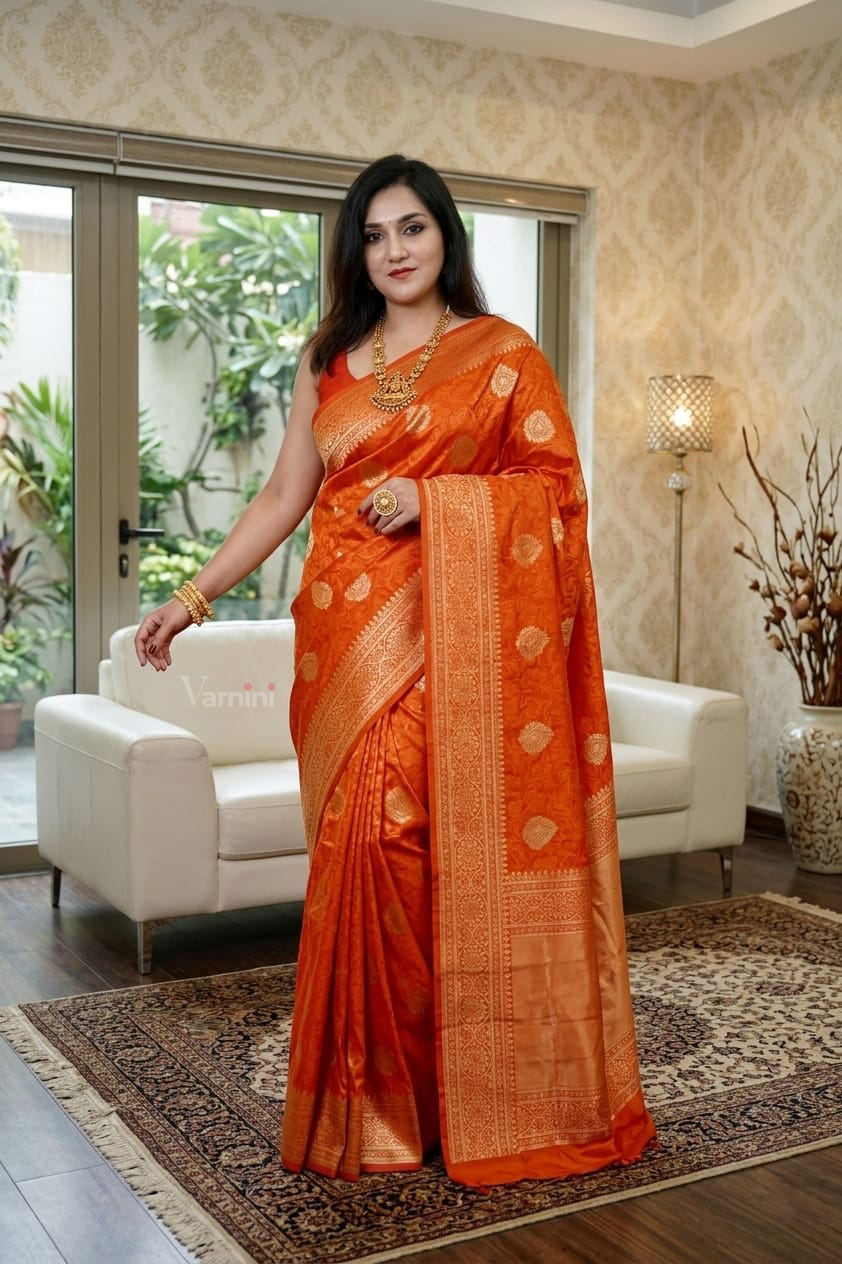 Color Palette: A brilliant Saffron-Vermilion body contrasted with intricate Antiqued Gold Zari work.