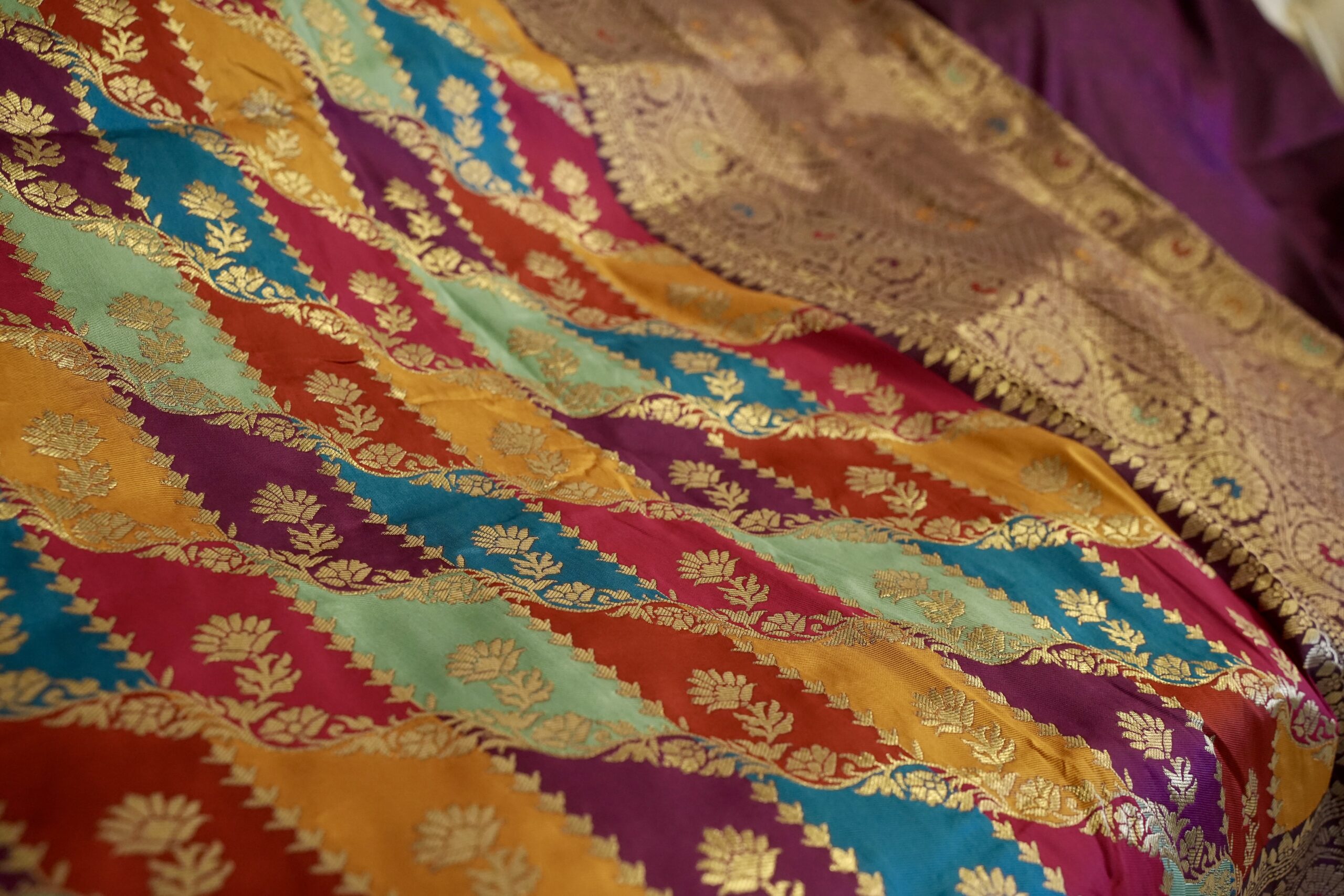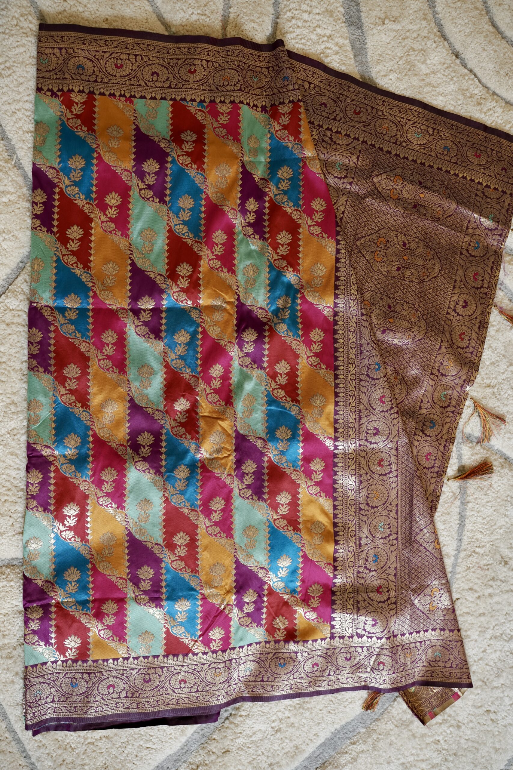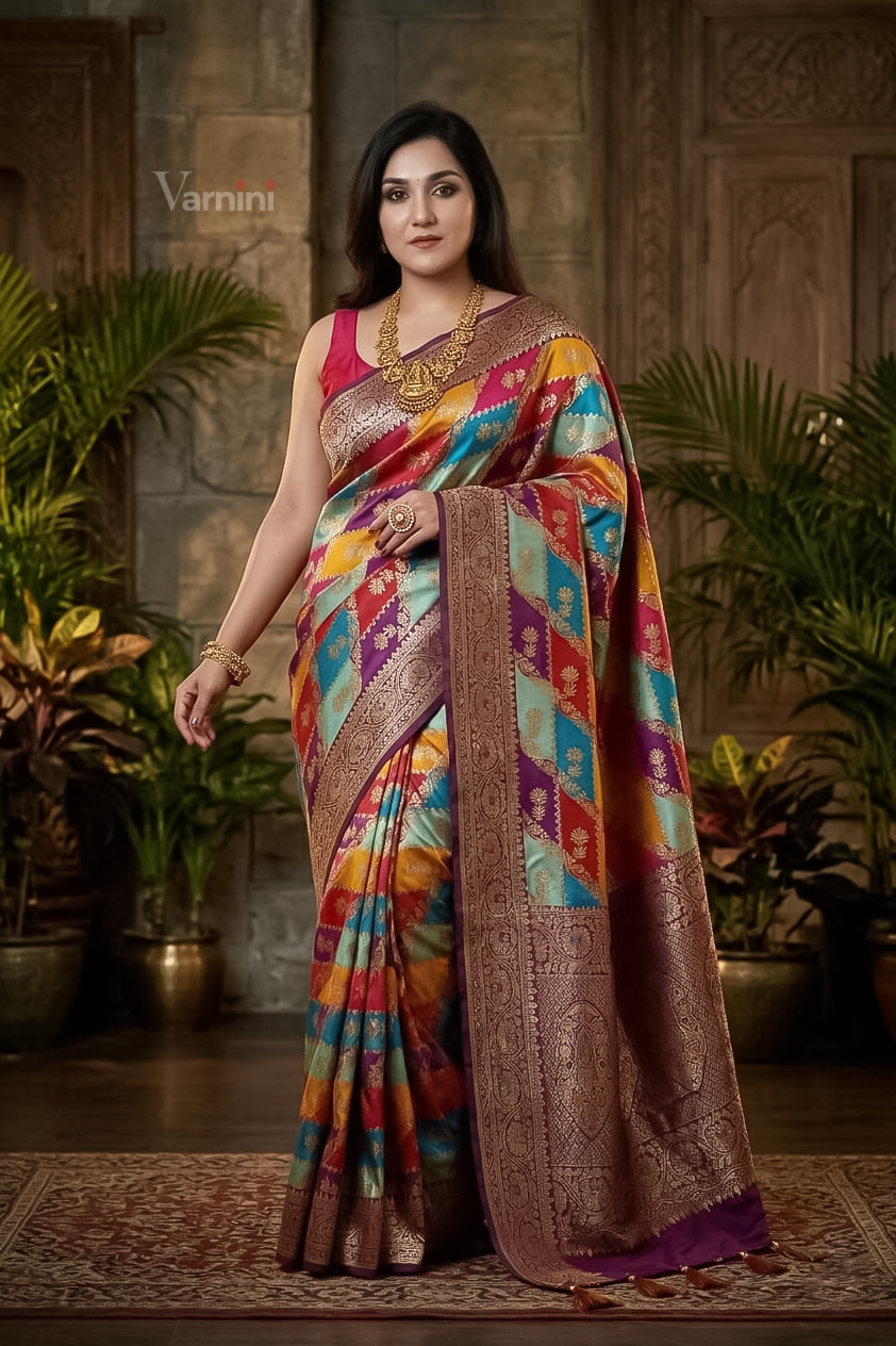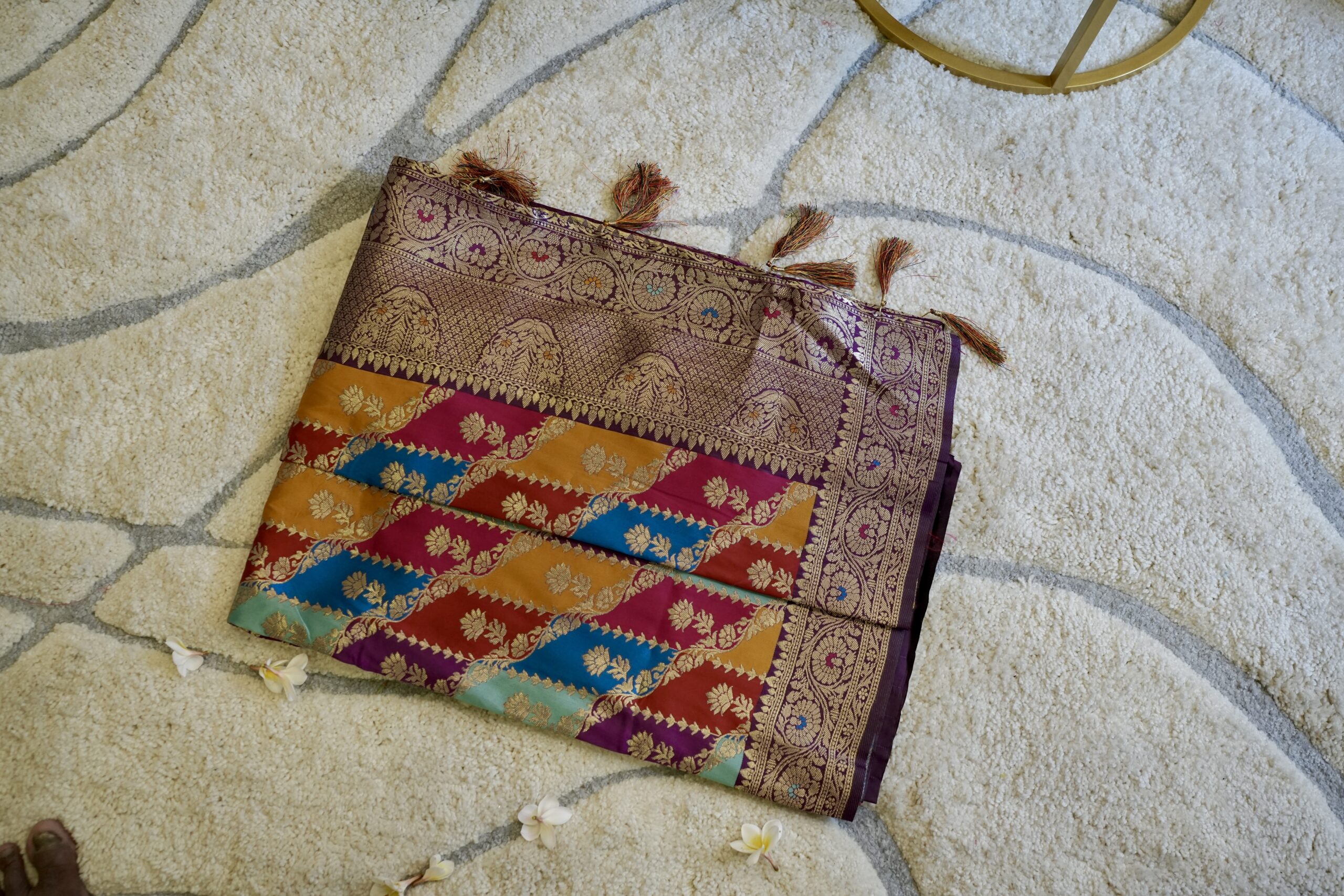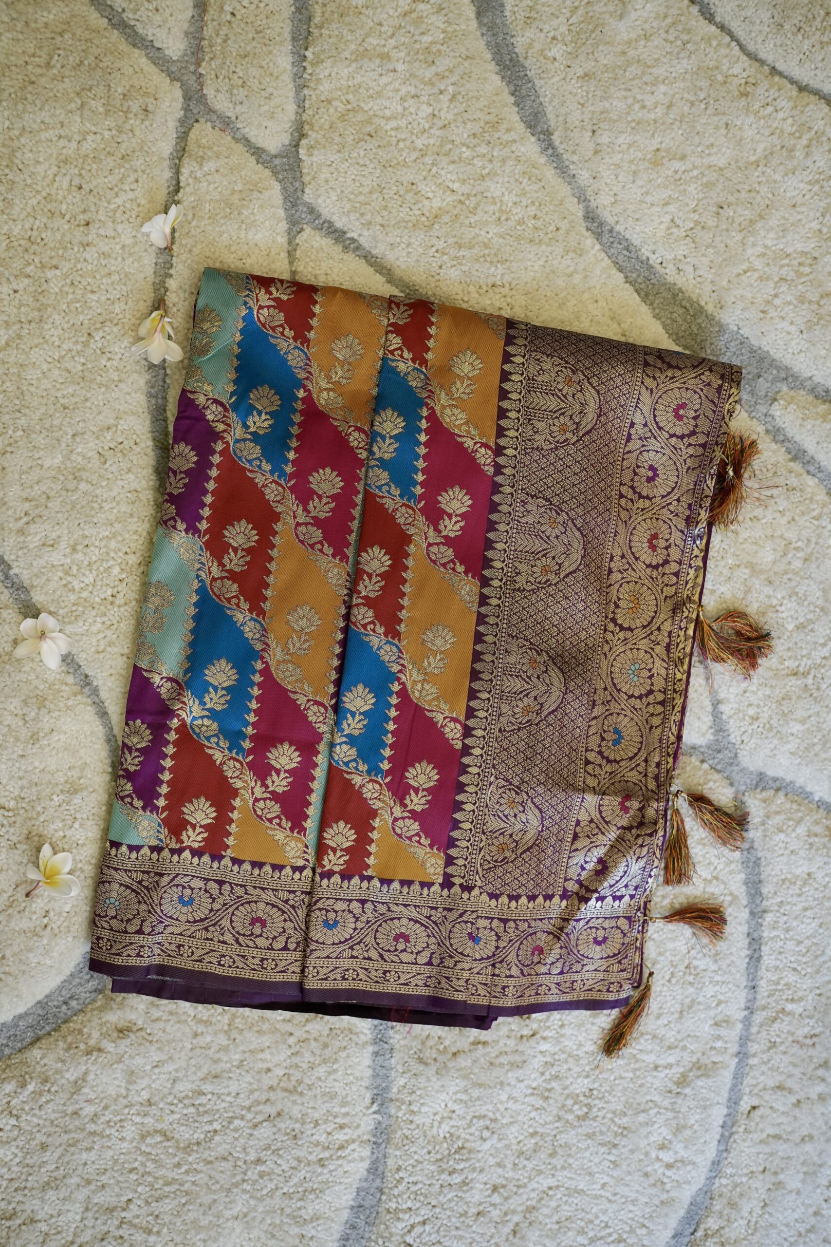 A vibrant silk saree adorned with rich multicolor diagonal panels highlighted by delicate gold zari floral butis. The luxurious deep plum brocade border and pallu feature intricate traditional motifs, adding regal depth and elegance.