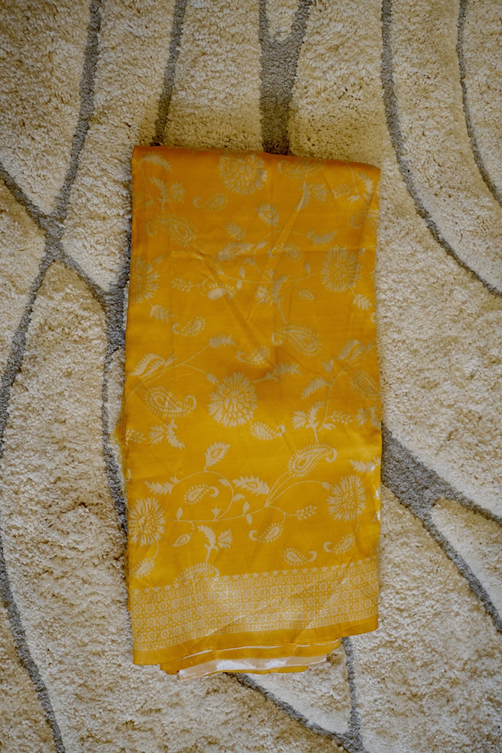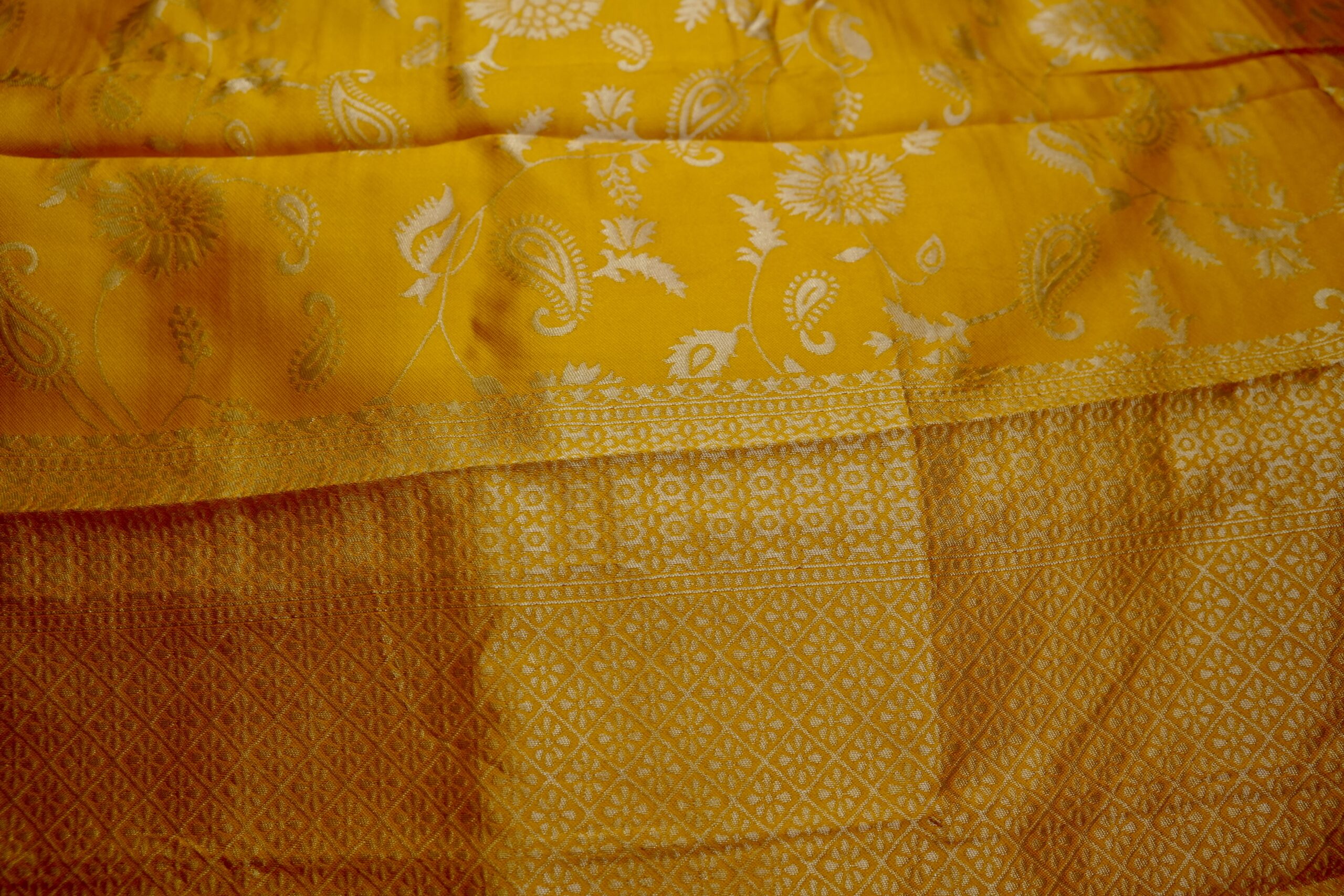 Color Palette: A luminous Golden Amber (Mango Yellow) base, accented with shimmering Silver Zari (Kashmiri-style) weaving.
