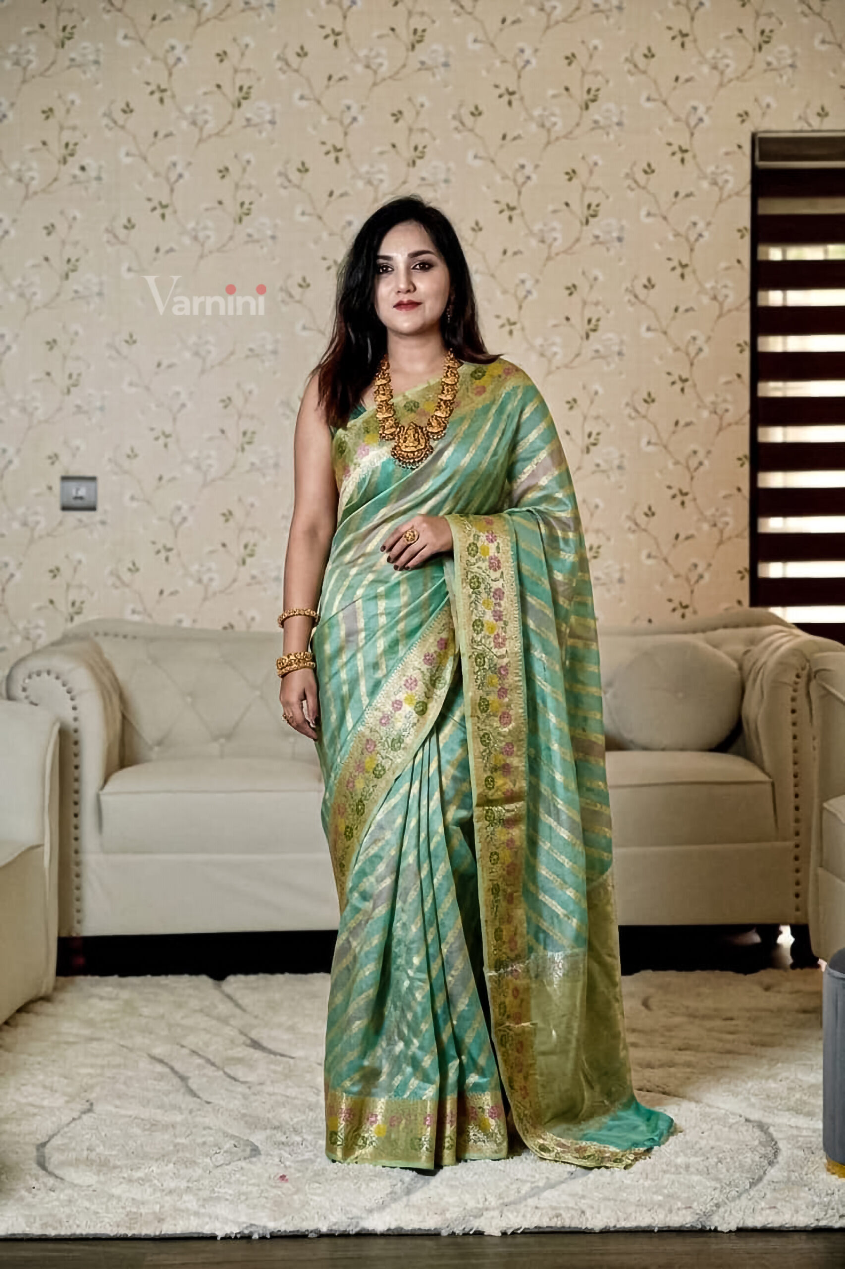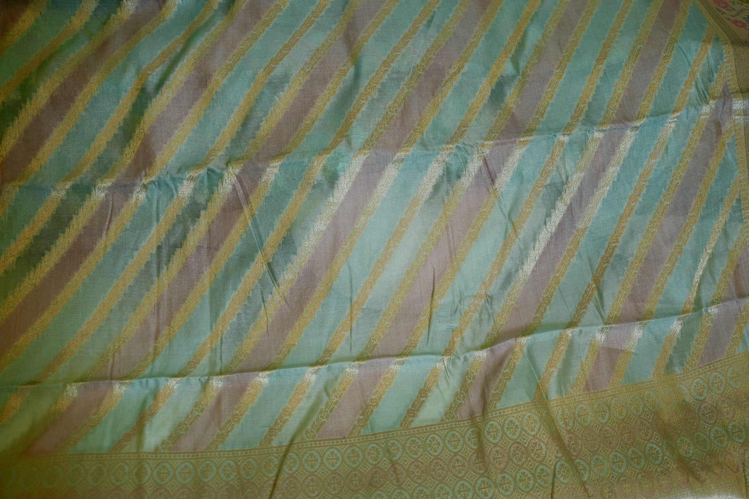 A soothing aqua-green silk saree adorned with soft diagonal zari stripes, beautifully complemented by a delicate floral woven border that adds graceful charm.