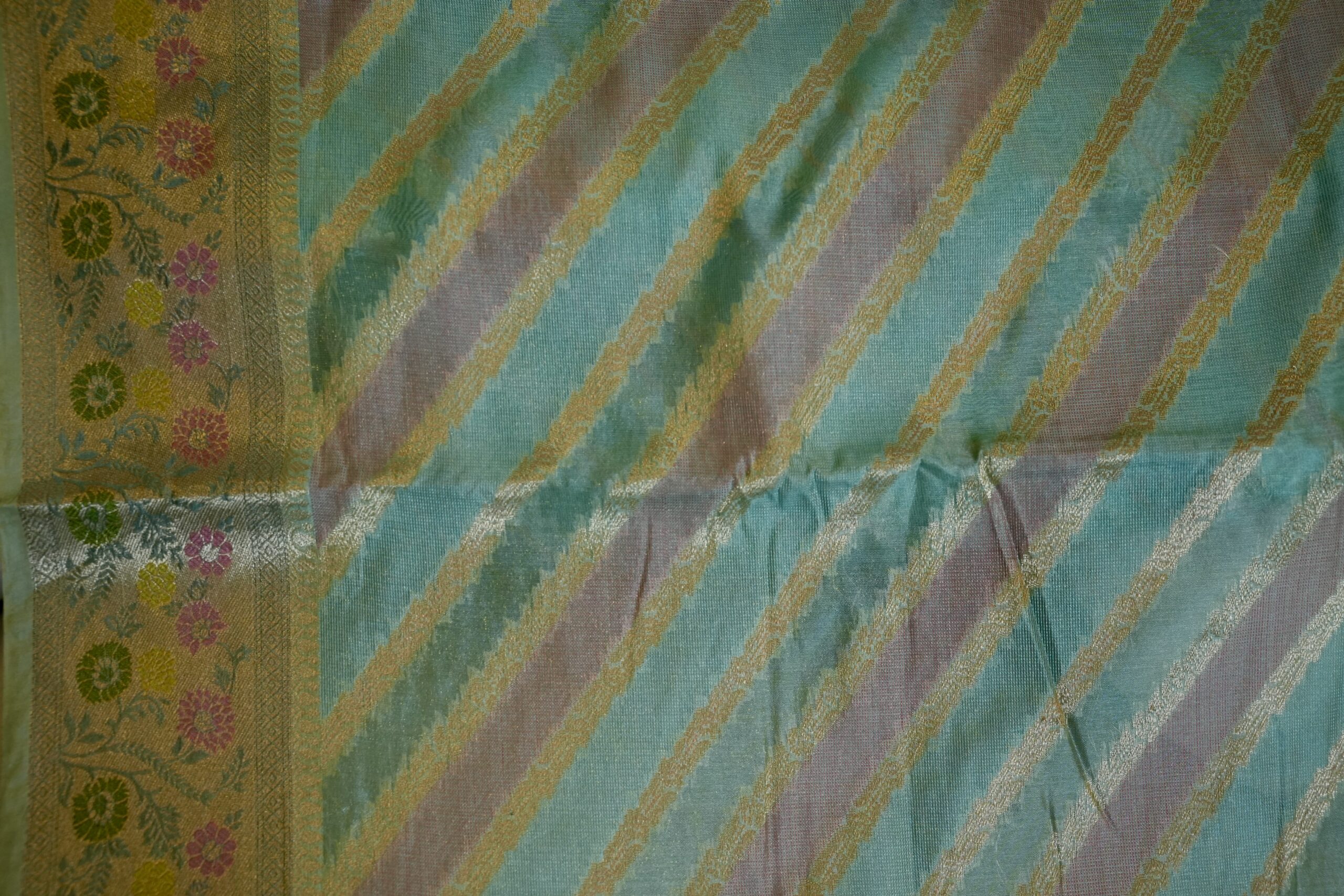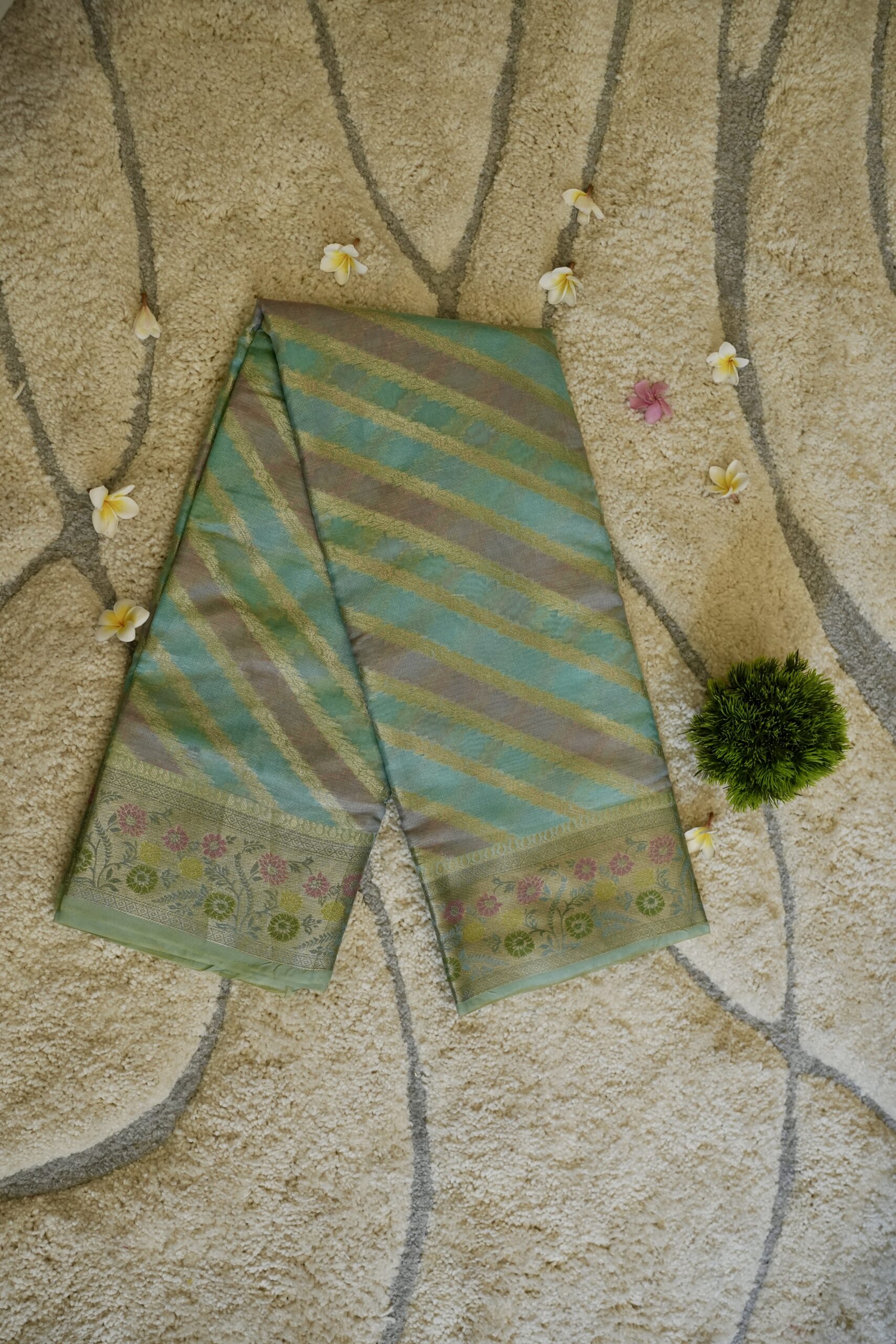 Elegant diagonal striped body with shimmering zari texture, finished with a pastel floral brocade border that brings a fresh, refined boutique appeal.