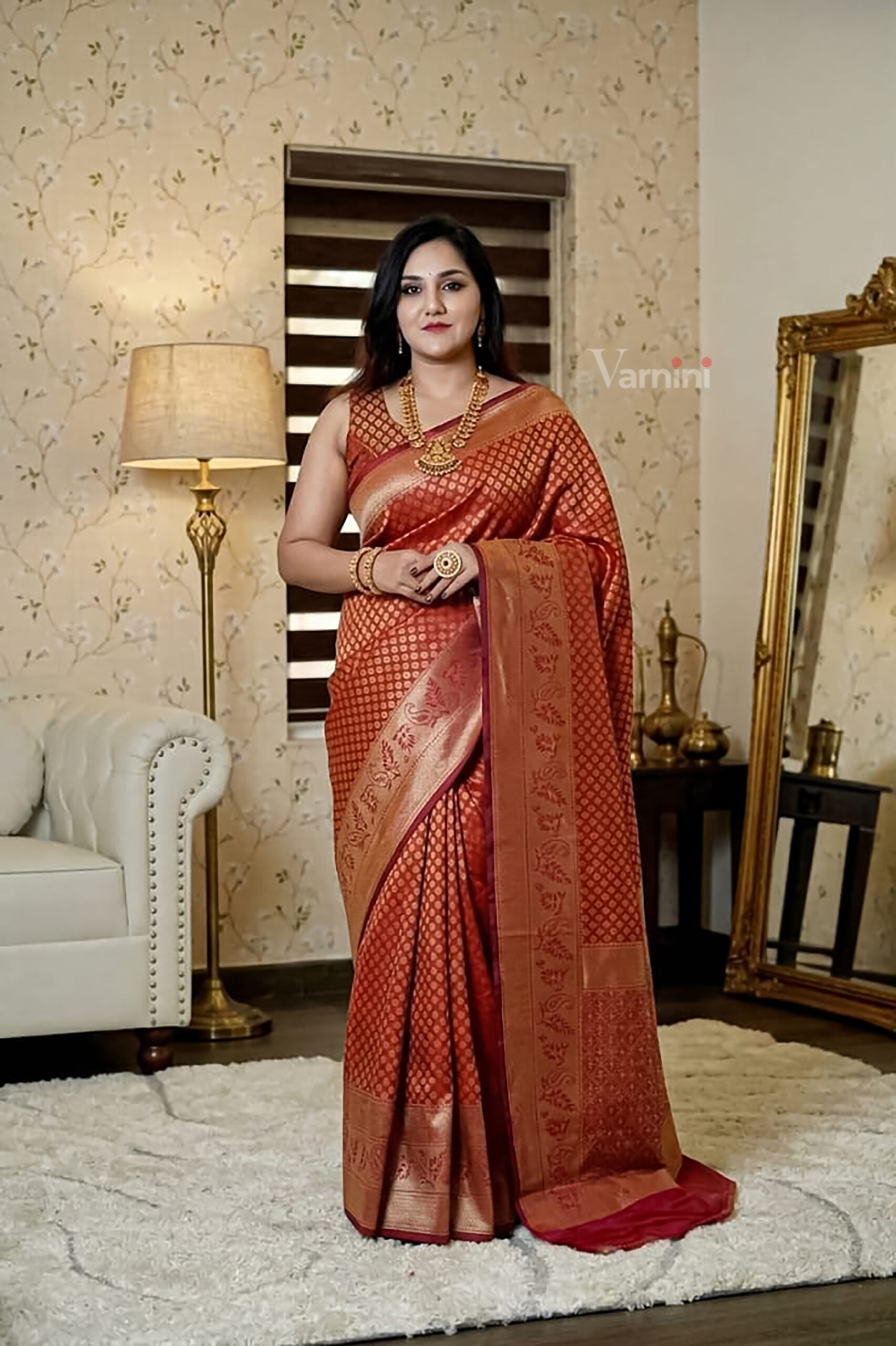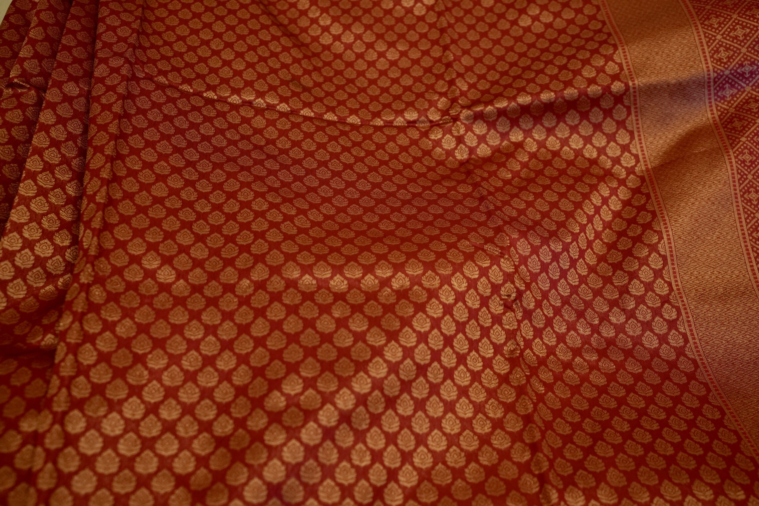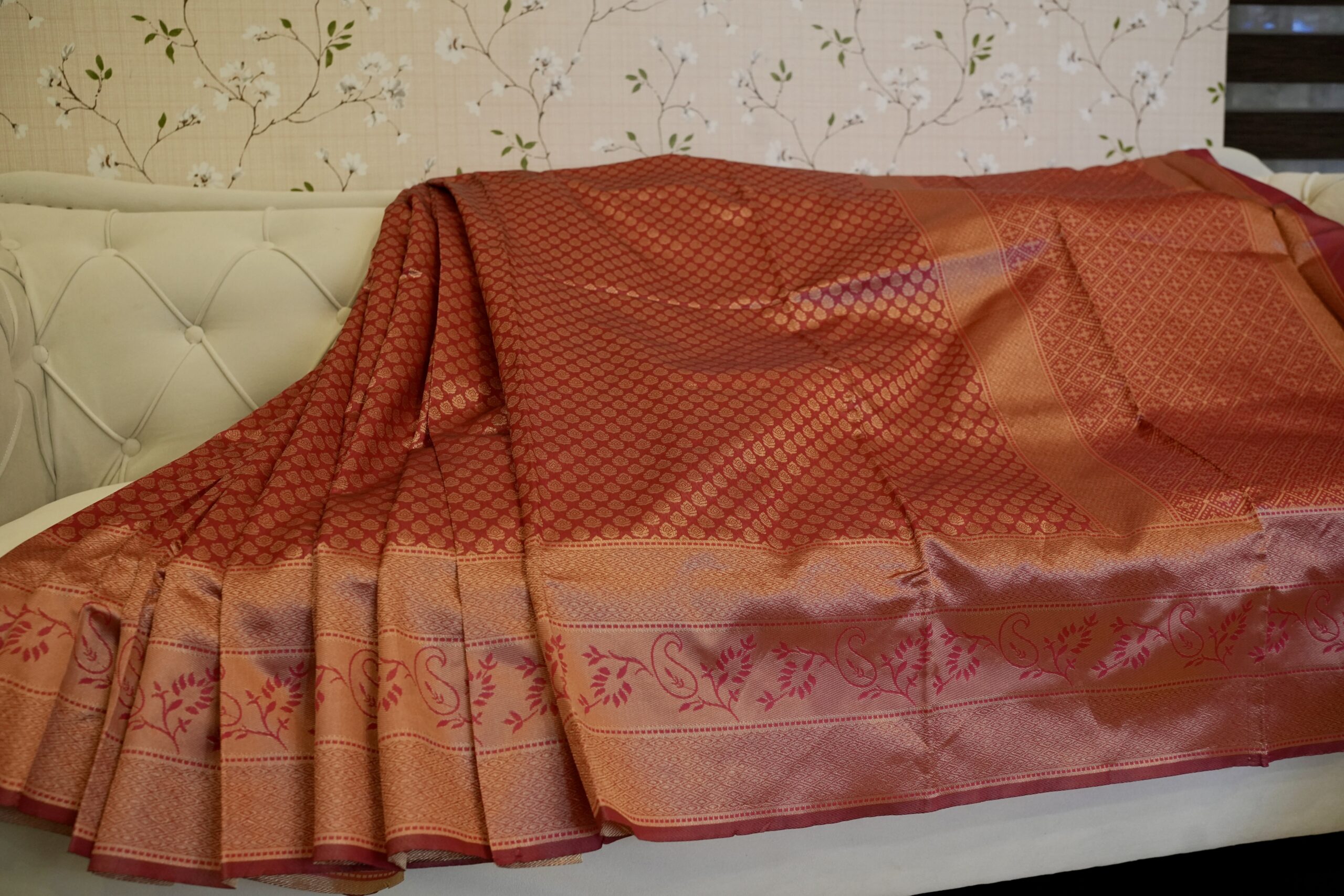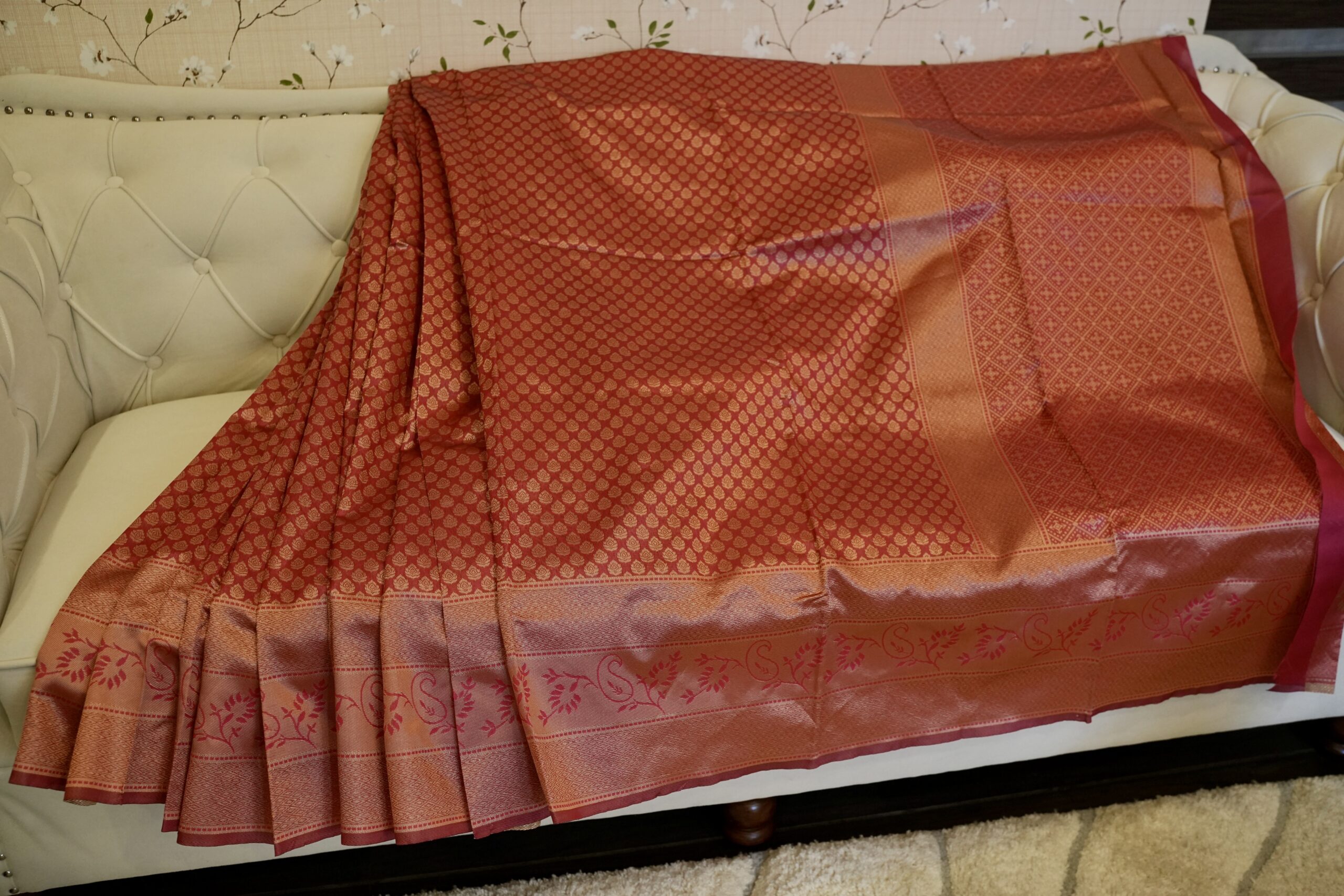 All-over zari buti pattern with a rich woven pallu showcasing floral vine accents and traditional diamond motifs, finished with a subtle contrasting border for a classic festive appeal.
