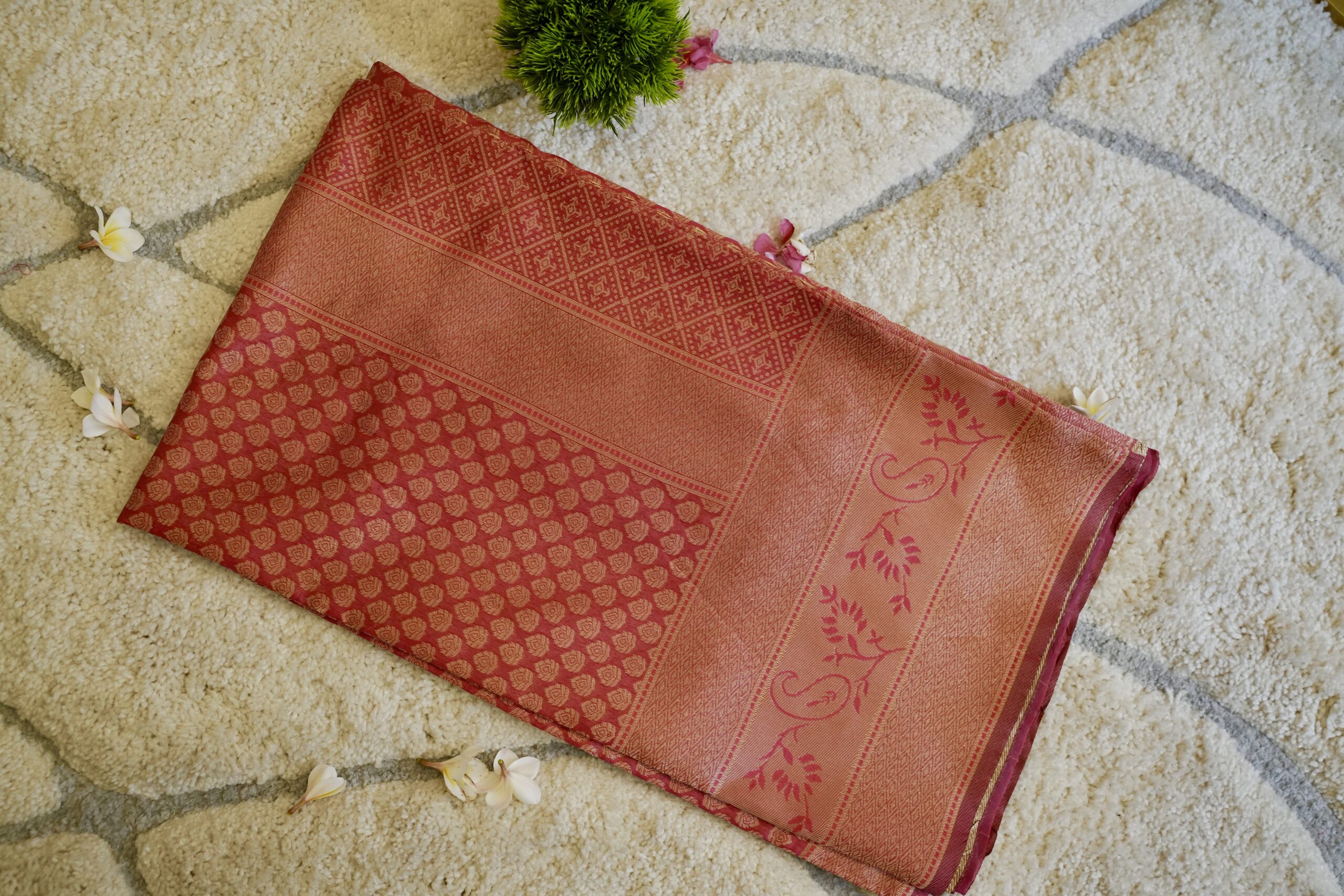 An elegant coral-pinkish red silk saree featuring delicate gold zari butis across the body, paired with a refined geometric brocade pallu and graceful vine motifs that add timeless charm.
